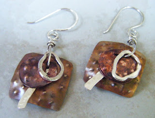 My first project are these ~The Stars Above~ mixed metal earrings. This is my version of the Stacked Spinner Necklace. I used brass, copper, and fine silver, that I cut, forged, textured and patinated. However, I didn't use a spacer in between each piece of metal because I didn't want the earring being too bulky. I had such fun making these earrings. I will definately be doing more of these and I'm eager to move on to the next project.